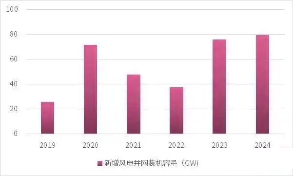 受国内“抢装潮”影响,2020年我国新增并网风电装机达71.67GW,高于过去三年之和,较2019年增长178.44%。2022年,我国新增并网风电装机37.63GW,虽然较2020年降低47.50%,但相较于2019年仍上涨了46.19%。2023年与2024年,我国新增并网风电装机容量分别为75.90GW、79.34GW,相较于2022年增长幅度分别达101.70%、110.84%。