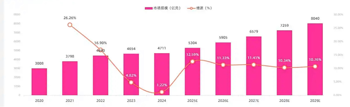 在全球贸易扩张、电商兴起及对环境可持续性需求不断增加的推动下,全球向数字化转变及自动化技术突飞猛进,全球仓储自动化解决方案市场出现大幅增长。根据中金企信最新市场调研数据显示,仓储自动化市场规模由2020年的人民币3,008亿元扩大至2024年的人民币4,711亿元,复合年增长率为11.9%。该增长预期将持续,预计市场于2029年将达到人民币8,040亿元,复合年增长率为11.3%。随着全球公司持续投资于自动化以提高运营效率、减少错误及支持可持续的实践,对先进仓储自动化技术和解决方案的需求预计将大幅增加。