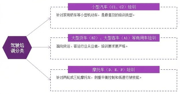 驾驶培训以掌握机动车驾驶操作技能、理解道路交通安全法律规范、形成安全驾驶意识为目标,需由具备资质的培训机构和教练员,按照统一教学大纲实施,最终帮助学员通过机动车驾驶证考试并具备独立安全驾驶能力。按培训车型不同,驾驶培训可以分为小型汽车(C1、C2)培训;大型货车(B2)、大型客车(A1)等商用车培训;摩托车(D、E、F)培训三大类。