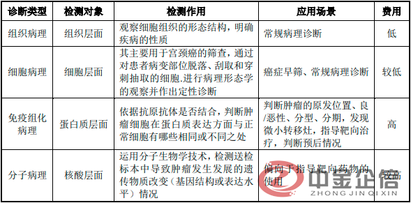 (1)病理诊断行业基本概述:病理诊断是肿瘤诊断的金标准,是通过研究疾病的病因、发病机制、形态结构、功能和代谢等方面的改变,揭示疾病的发生发展规律,从而阐明疾病本质,在肿瘤领域有着极为广泛的应用。病理学根据发展阶段的不同主要分为传统病理技术(组织病理、细胞病理)、免疫组化病理和分子病理。传统的组织病理建立在组织、细胞的水平上,病理医生通过显微镜观察组织或细胞样本的改变来研究疾病的发生发展规律,阐明疾病本质。免疫组化病理建立在蛋白质水平上,可以进一步判断肿瘤的组织来源、原发部位、病理分型、残留边缘癌细胞等,既能够辅助诊断疾病,也能够指导预后。分子病理建立在核酸分子水平上,能够确定肿瘤的基因突变类型,用于后续靶向药物的指导以实现精准医疗。
