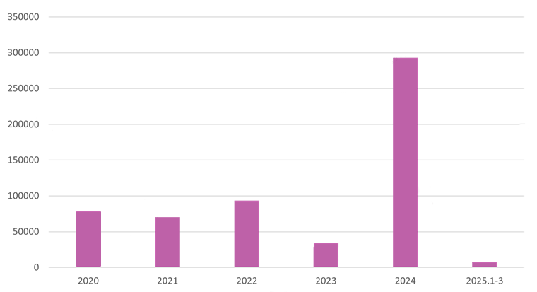 2020-2025年3月中国可控核聚变招投标规模(单位:万元)