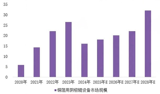 受益于各种政策支持,铜箔行业市场空间极大,这也为阴极辊行业的发展提供了有力的支持。根据中金企信最新市场调研数据显示,2023年中国铜箔用阴极辊设备市场规模达26.5亿元,同比增长20.45%;经历2024年调整期后,预计到2028年市场规模将增长至32亿元,行业在技术驱动下前景明确。