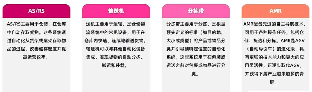 仓储自动化是指应用先进的信息技术、自动化技术及人工智能技术,实现包括存取、搬运、拣选和分拣等各类物流作业的自动化集成系统。仓储自动化解决方案包含多种技术和形式,不仅实现了以自动化方案替代重复性人力劳作,还具备数据分析及流程优化的先进功能。其将硬件和软件无缝结合,涵盖一系列技术,包括AMR、AS/RS、输送机和分栋带。