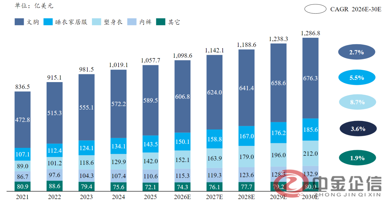 全球女士内衣市场呈稳健增长态势,根据中金企信最新市场调研数据显示,2021-2025年市场规模持续扩张,2025年整体市场规模达1,057.7亿美元,预计2025-2030E年仍维持稳定增长节奏,2030年整体规模超1,286.8亿美元。其中,文胸为核心主导品类,2030年预计实现规模676.3亿美元,鉴于传统文胸及内衣品牌市场成熟,头部品牌营收放缓,2026-2030年复合增长率(CAGR)约2.7%。睡衣家居服、内裤等品类随消费需求升级增速表现突出,睡衣家居服从2021年的107.1亿美元增至2030年的185.6亿美元,塑身衣从89.1亿美元增至212.4亿美元。
