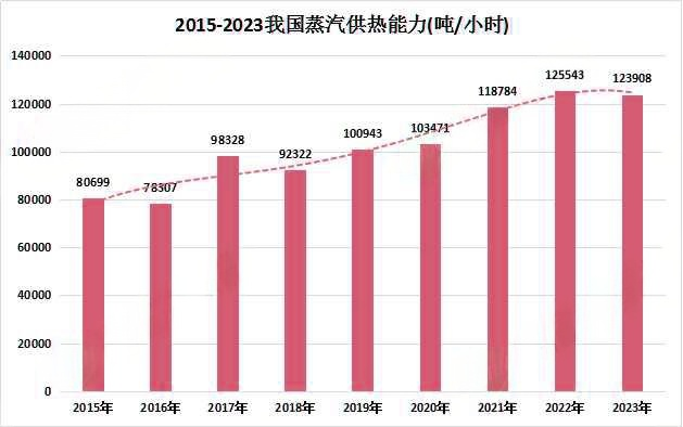 根据中金企信最新市场调研数据显示,2015-2023年,全国集中供热蒸汽供热总量整体呈现上升趋势。2023年全国蒸汽供热能力12.39万吨/小时,同比2022年略降1.3%。